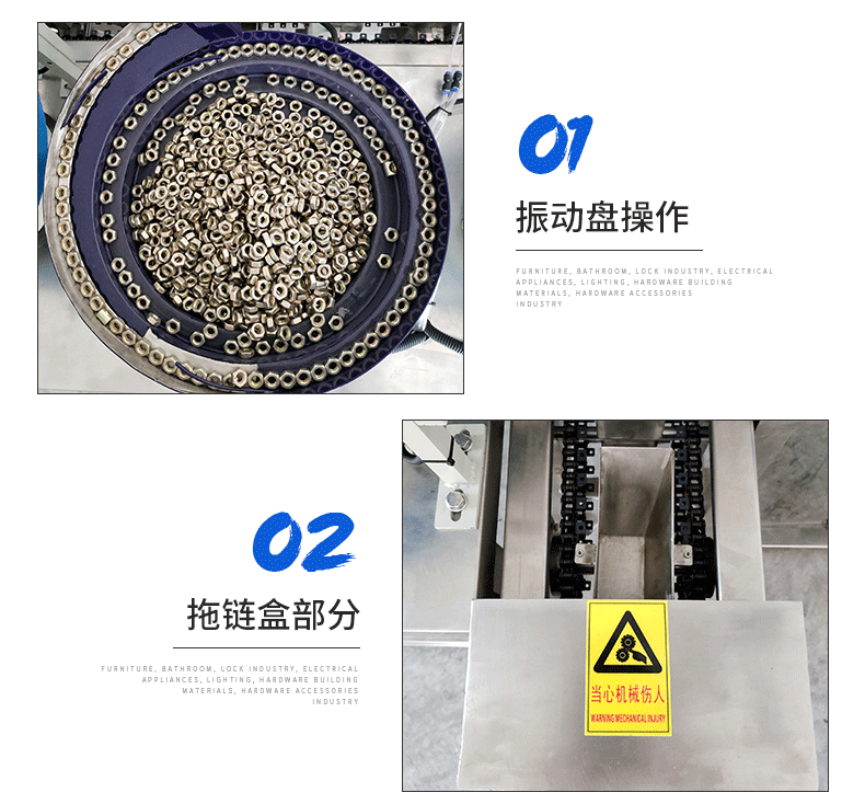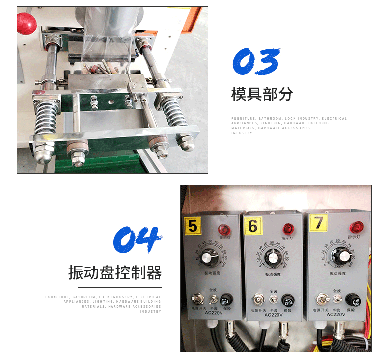 可帶多個(gè)振動(dòng)盤,目前是20套振動(dòng)盤,可同時(shí)將多種不同的物料包裝到包裝袋內(nèi),您也可以選擇性地用其中的一個(gè)、兩個(gè)、三個(gè)或四個(gè)振動(dòng)盤(即單款單獨(dú)包裝、2款混合包裝、3款混合包裝、4款混合包裝);廣泛應(yīng)用于家具、衛(wèi)浴、鎖業(yè)、電工、電器、燈飾、五金建材等制造工業(yè)的附屬安裝螺絲、五金配件。